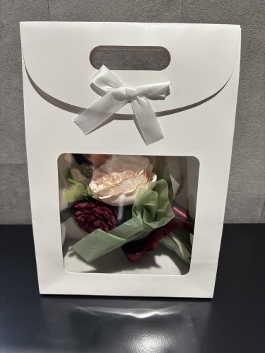 しっかりとしたオフホワイトの紙製ボックスは、横長でマットな質感。中央には可愛らしい白いサテンリボンを蝶結びにし、手に取った瞬間から特別感が伝わります。右側には透明な窓があり、ボックスを開ける前から中のブーケが見えるデザインです。