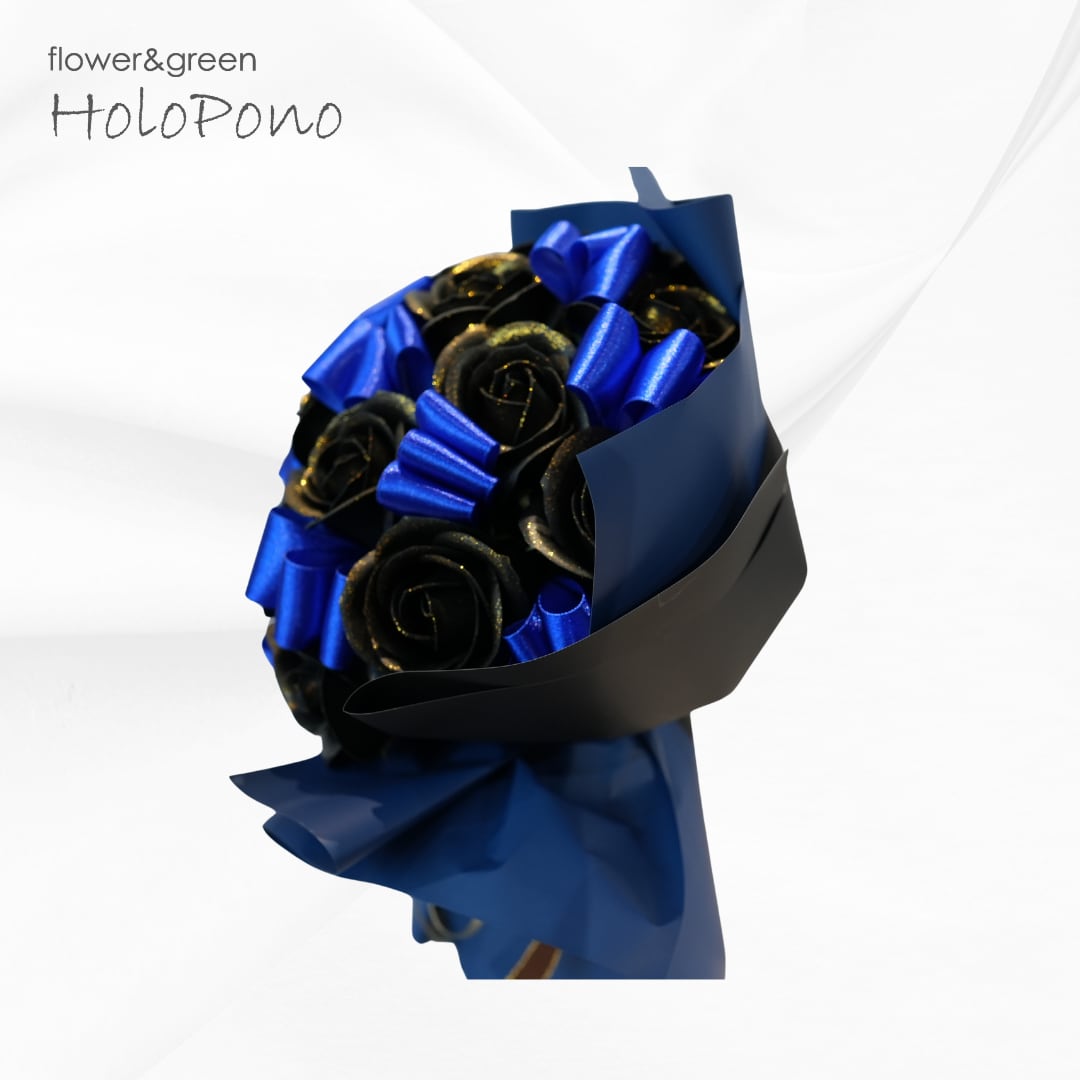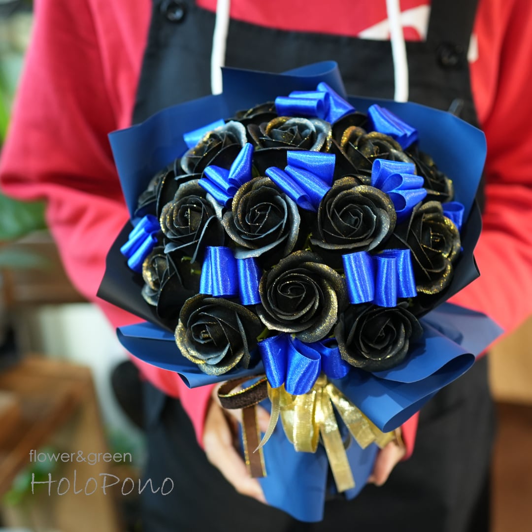 深いブルーと漆黒のローズが織りなす、ラグジュアリーな雰囲気のスタンディングブーケ。
