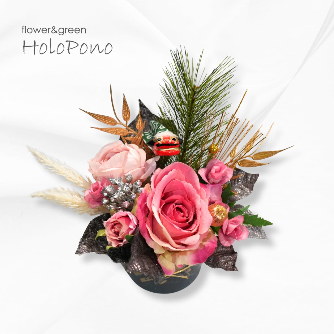 ・華やかなピンクローズと松の組み合わせで上品な印象