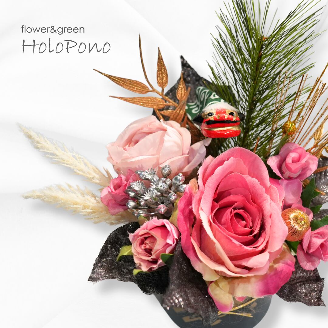 お正月の縁起物「獅子舞」と優美なピンクローズを組み合わせた、