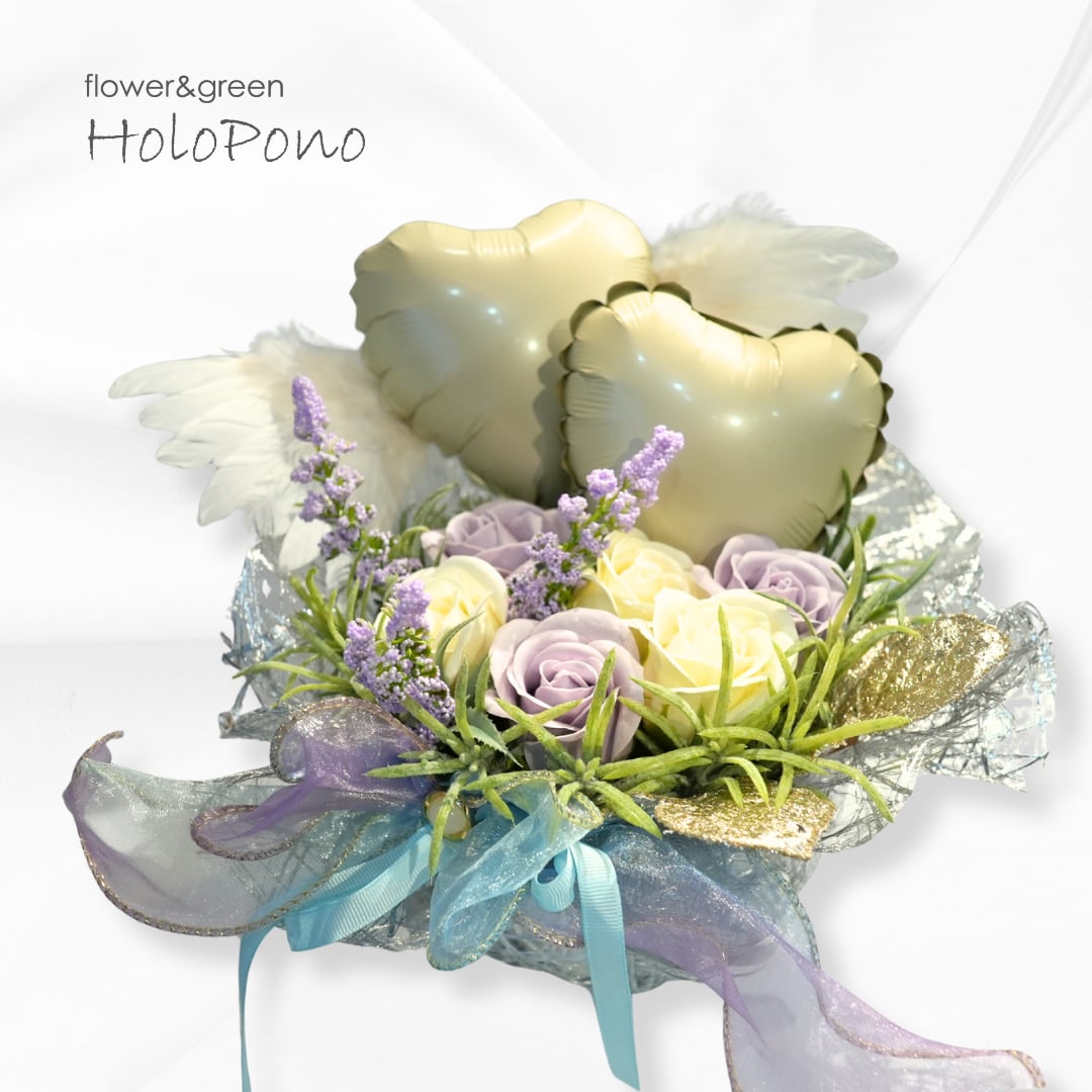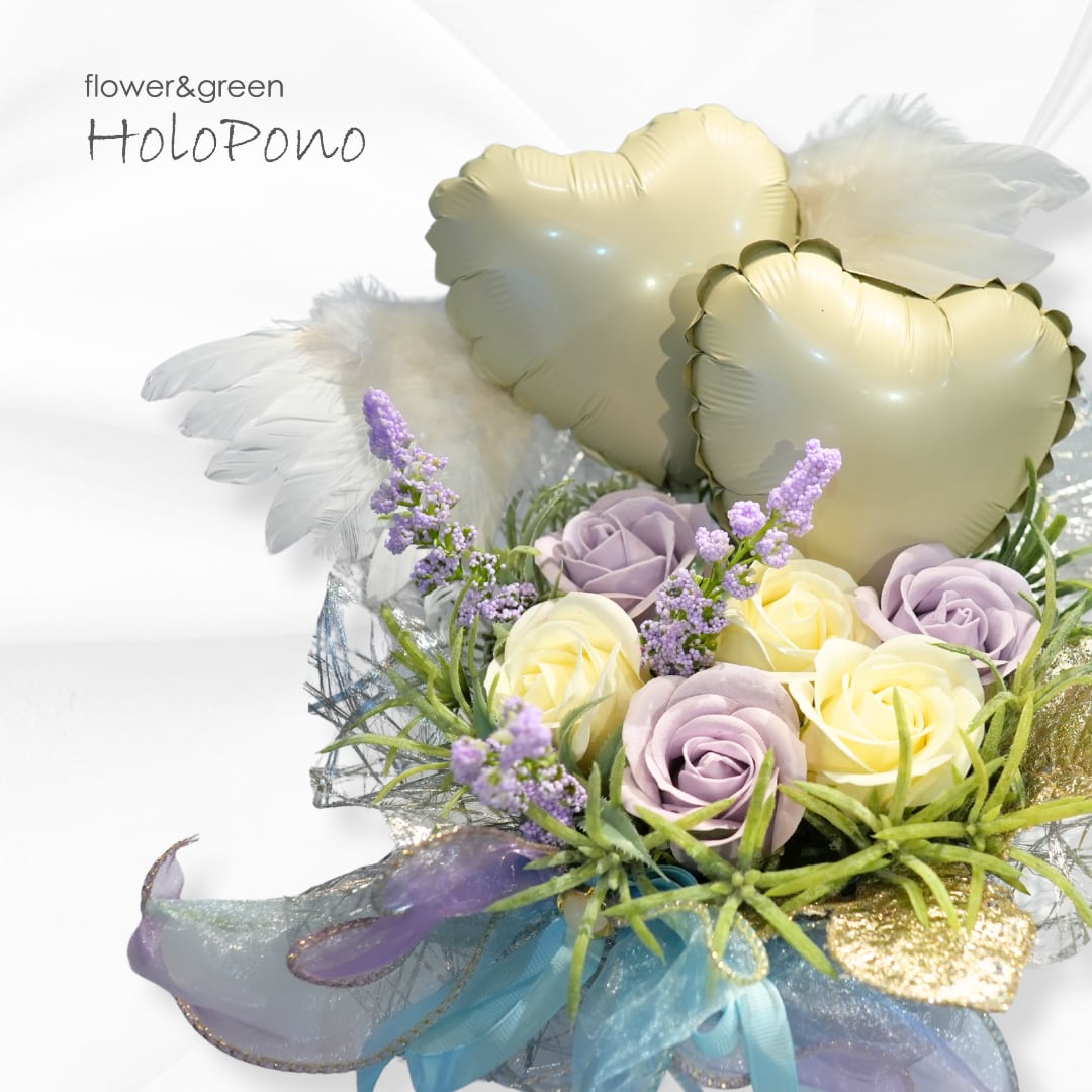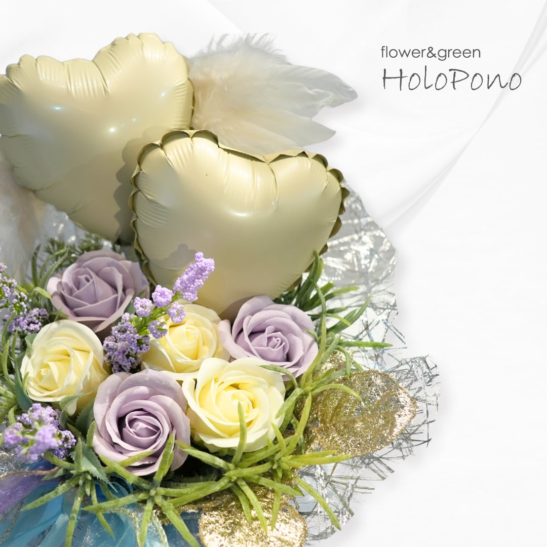 ■ 素材 石鹸素材(ソープフラワー)、バルーン、フェザー(羽)、装飾パーツ、ラッピング資材 ※香りは鑑賞用としてほんのりと香る程度で、時間の経過とともに薄れます。