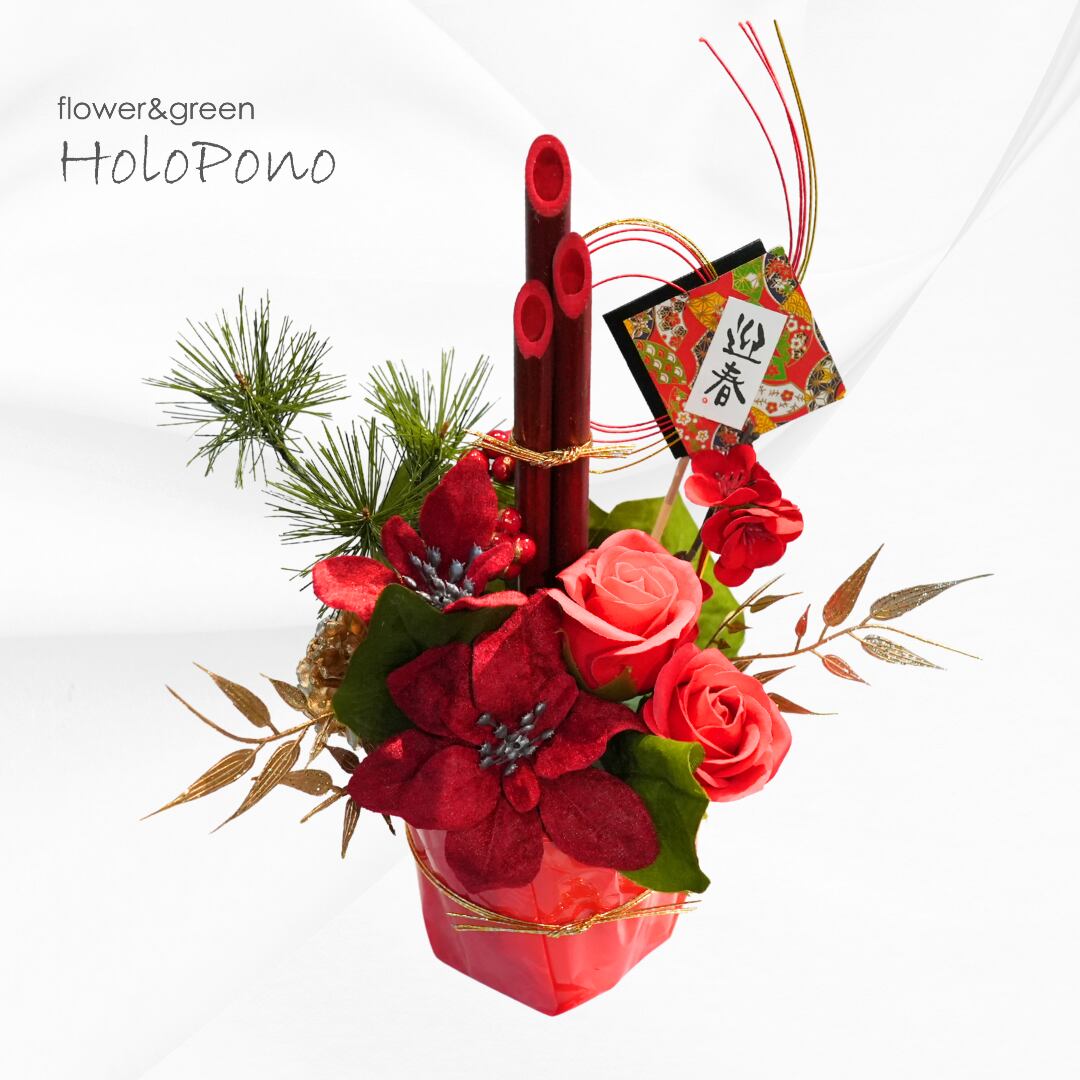 鮮やかな「赤」を基調とした、華やかでモダンなソープフラワーのお正月飾りです。