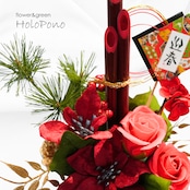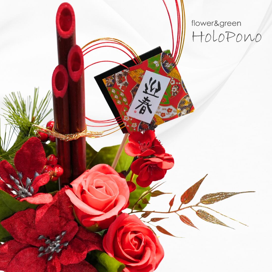 【Point 2:お正月に欠かせない松と金飾り】 長寿を象徴する「松」のグリーンと、きらびやかなゴールドのリーフ、そして水引がアクセントとなり、新年を迎えるのにふさわしい豪華な仕上がりです。 「迎春」のタグが、お正月気分をより一層盛り上げます。