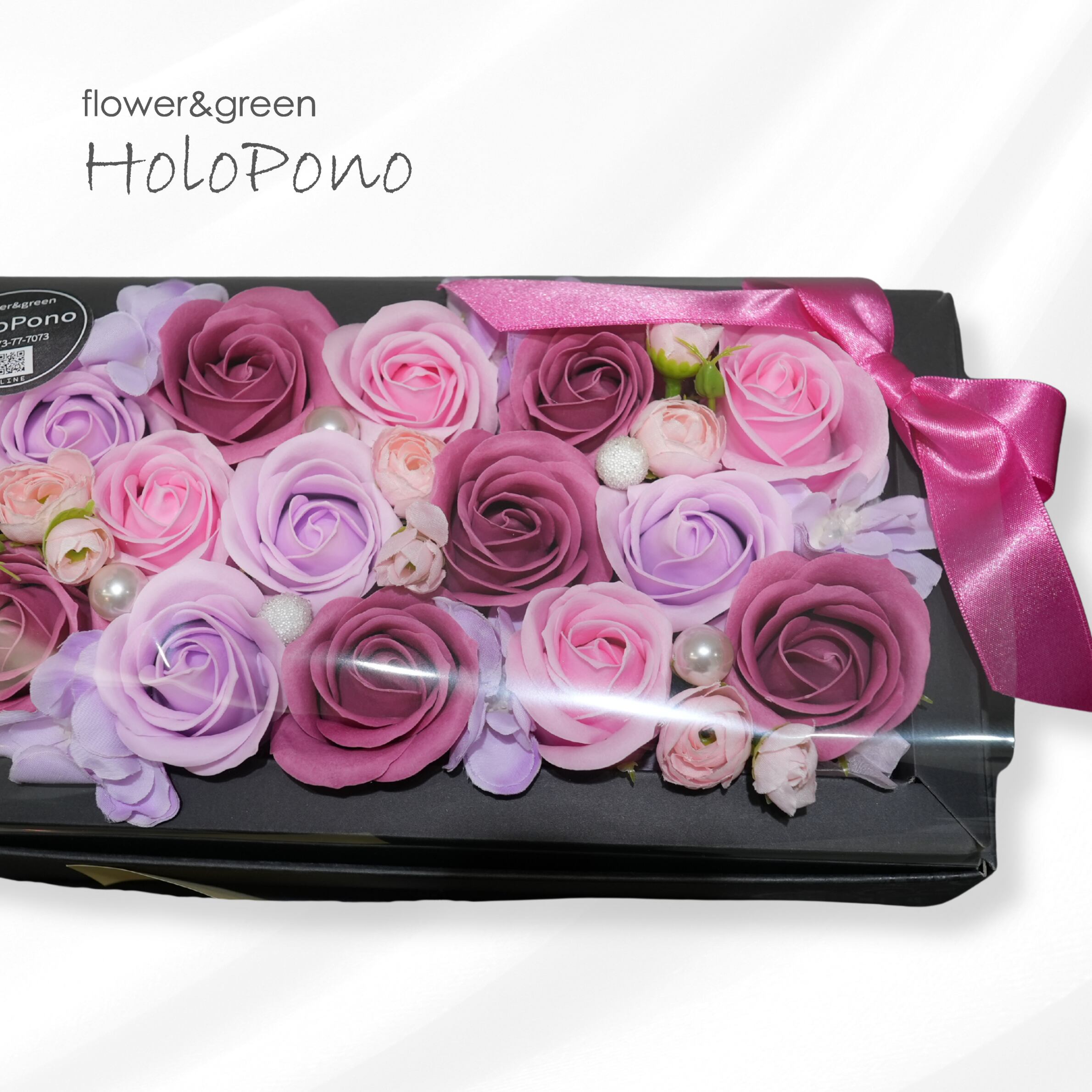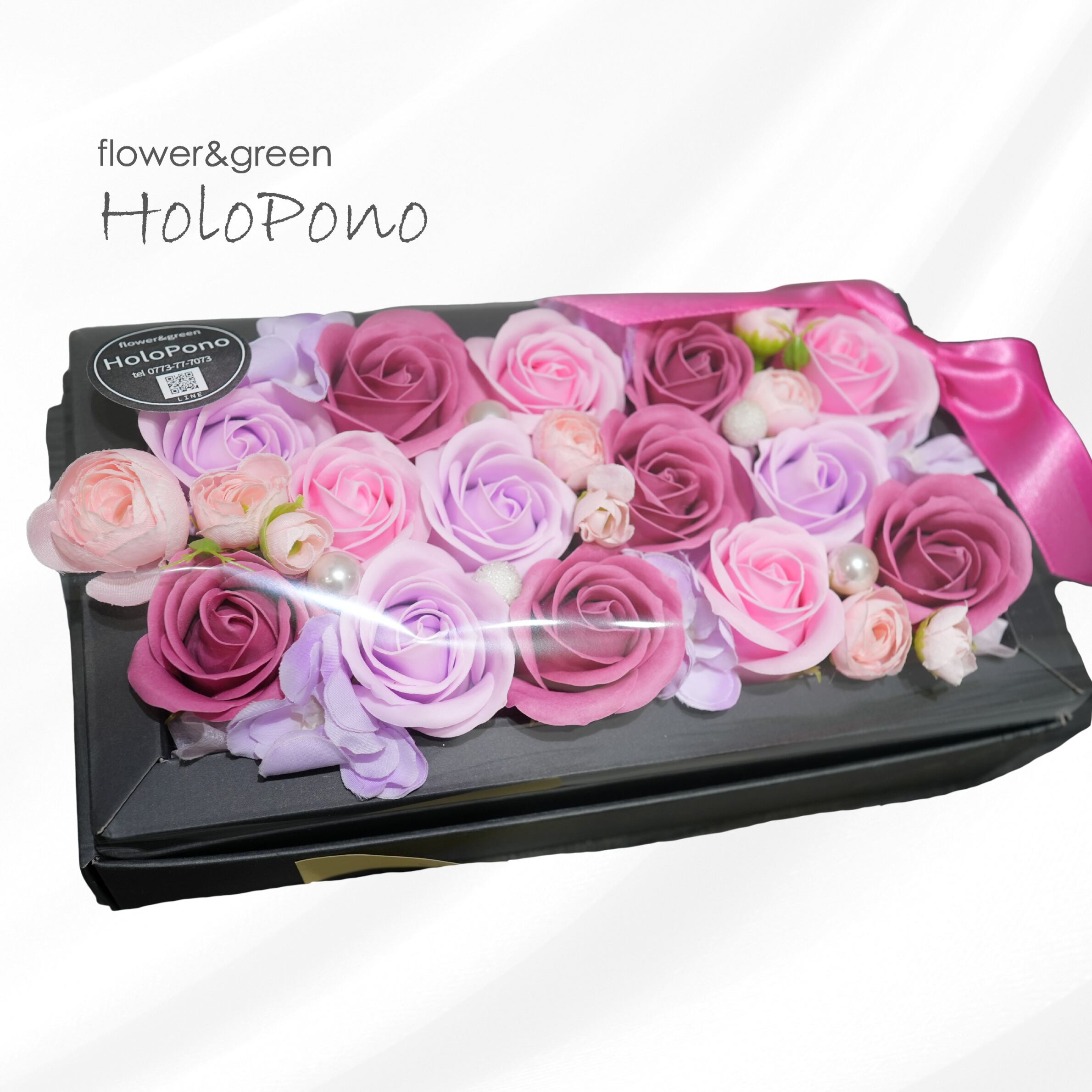 シックな黒いボックスに、ピンクとパープルのローズを贅沢に詰め込んだ、高級感あふれるソープフラワーボックスです。