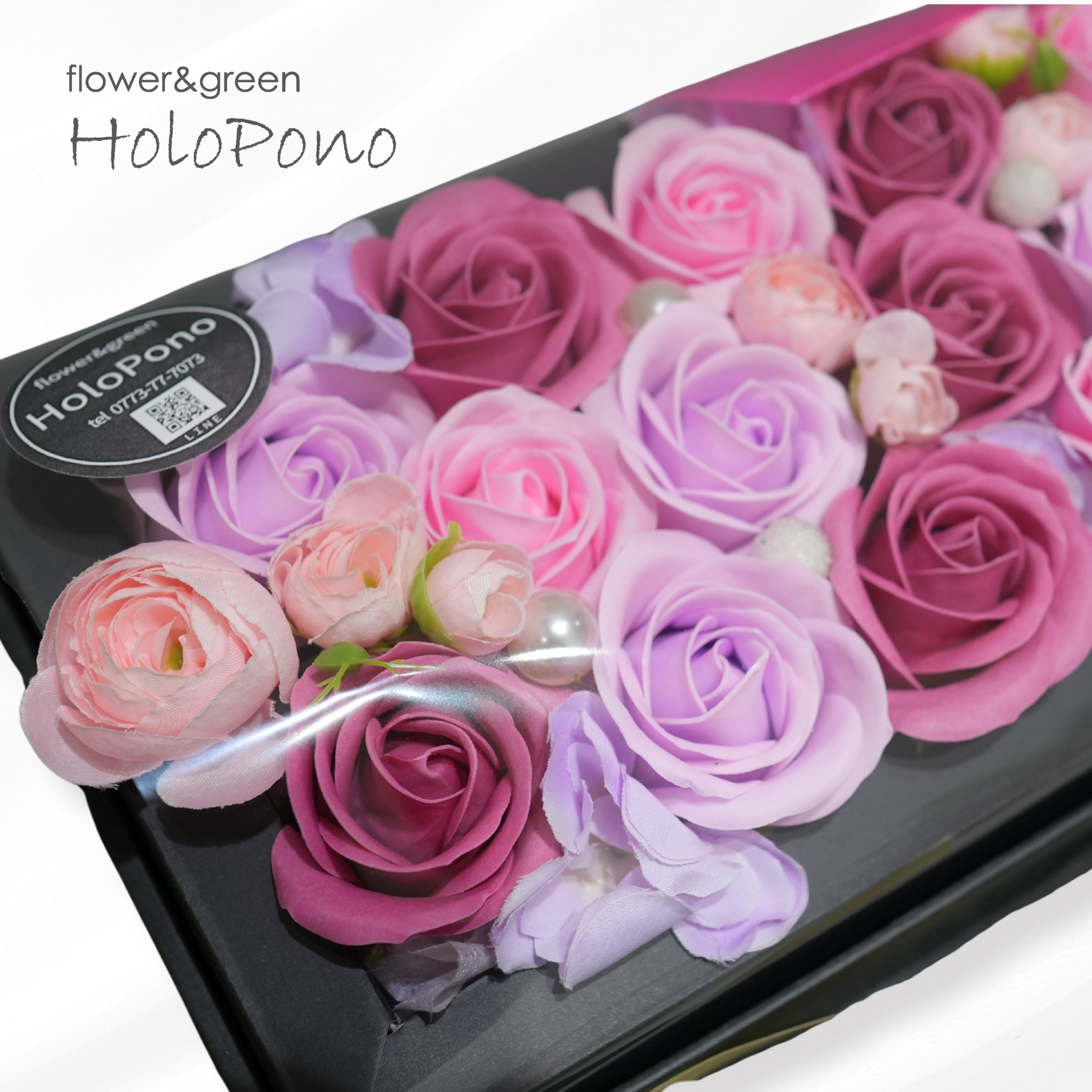 ■ 素材 石鹸素材(ソープフラワー)、ボックス(紙製・プラ窓等)、パール、リボン、アーティフィシャルフラワー(小花・葉) ※香りは鑑賞用としてほんのりと香る程度で、時間の経過とともに薄れます。