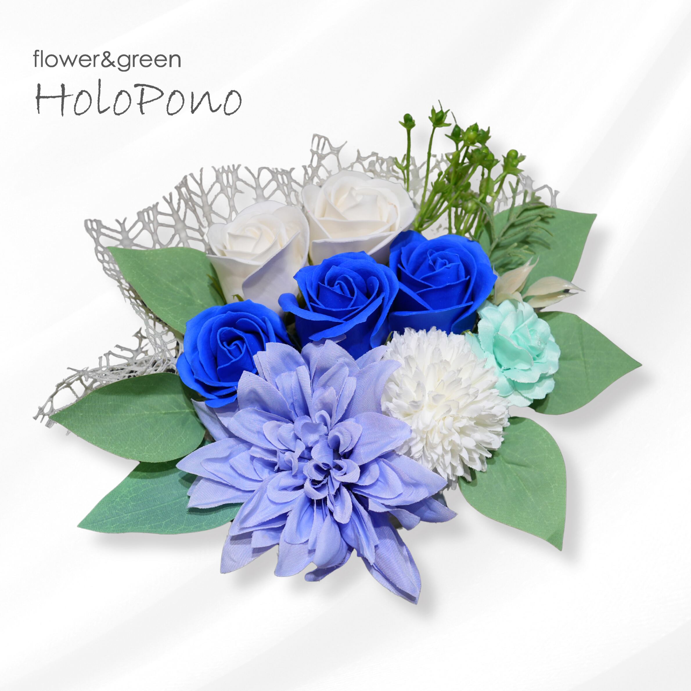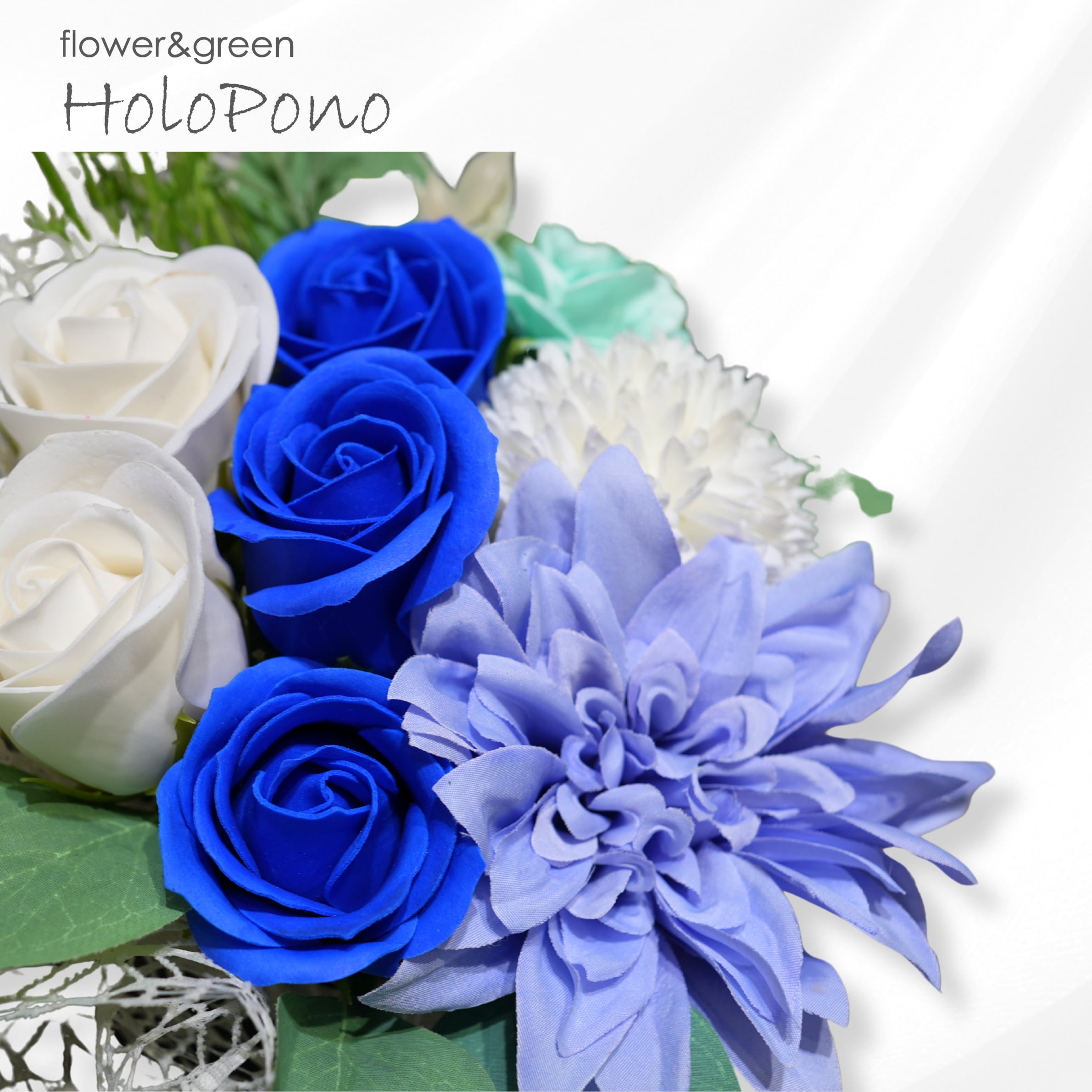 鮮やかな「ブルー」と清楚な「ホワイト」でまとめた、清涼感あふれるソープフラワー&アーティフィシャルフラワーのアレンジメントです。