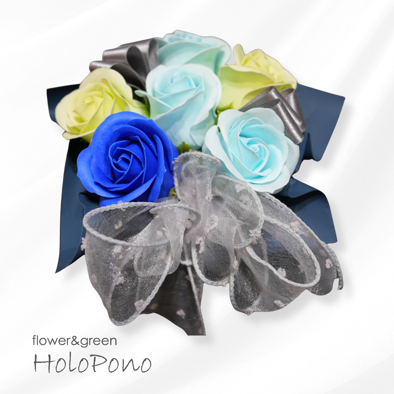【Point 1:目を引くクールなカラーリング】 深みのある「ロイヤルブルー」、透き通るような「ライトブルー」、そしてアクセントとなる「イエロー」のローズを組み合わせました。 寒色系に黄色を差すことで、クールな中にもポップな明るさが加わり、他にはない個性的でお洒落なデザインに仕上がっています。